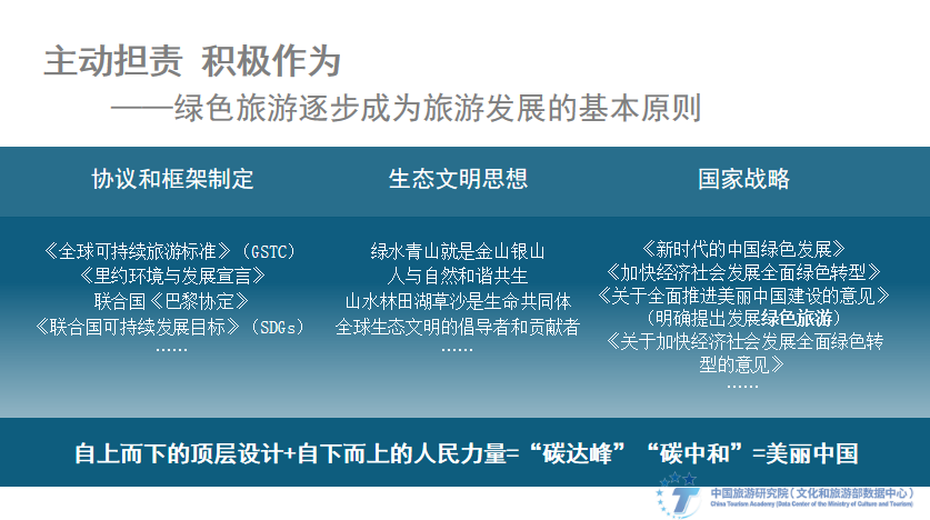 我们更加关注环境,主动担责,持续作为。《全球可持续旅游标准》《里约环境与开展宣言》、联合国《巴黎协定》《联合国可持续开展目标》等国际标准和公约相继出台,习近平生态文明思想、绿色开展理念的重要论断,为新时代中国绿色旅游开展给予了理论遵循和思想指引。